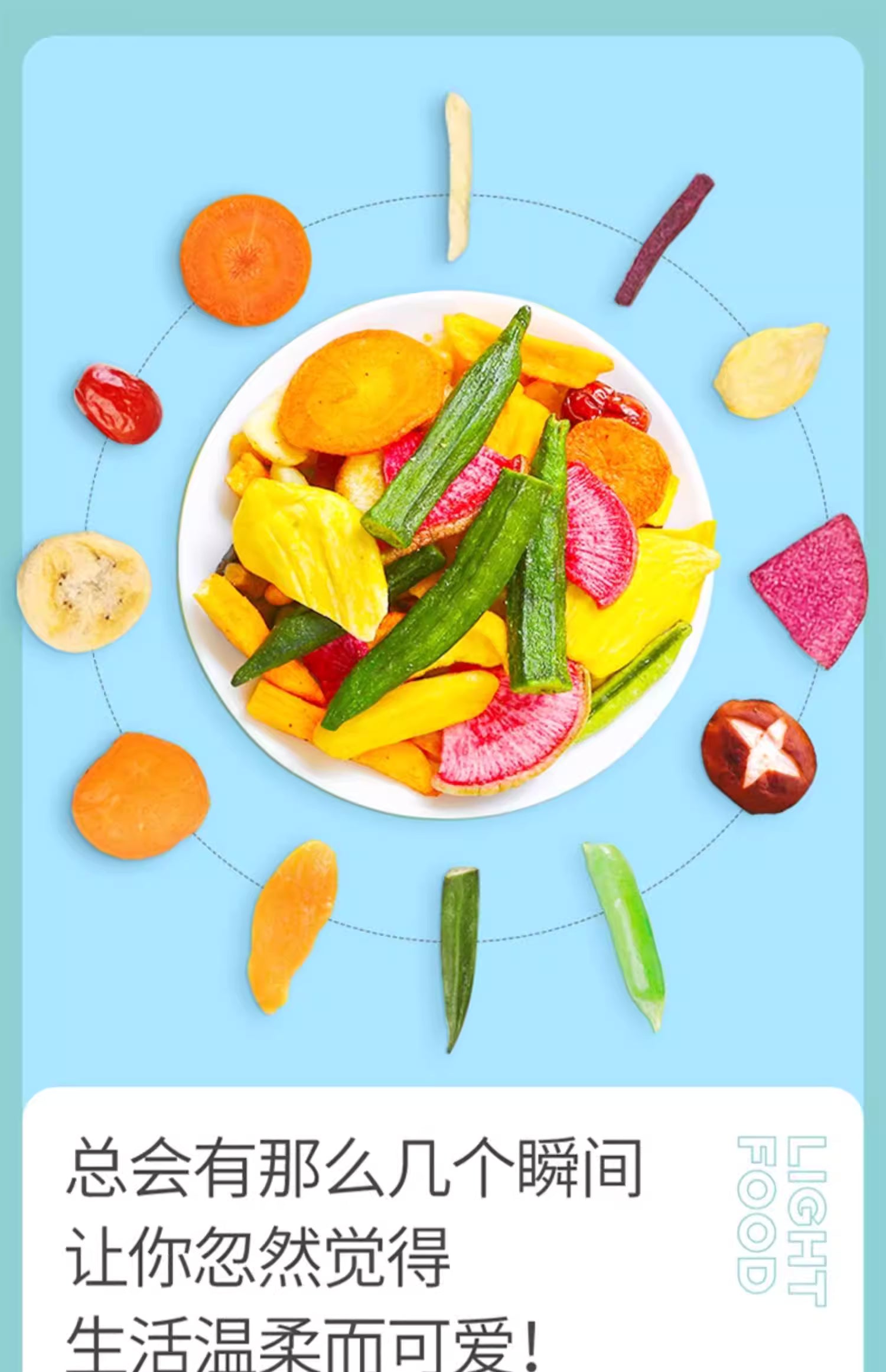 甄选多种果蔬原料制成的综合果蔬脆,采用低温脱水等果干工艺加工,保留果蔬本身的色泽与风味,口感轻脆爽口。多种果蔬合理搭配,一袋即可体验丰富口感层次,适合日常零食、下午茶或轻食搭配。