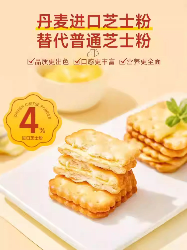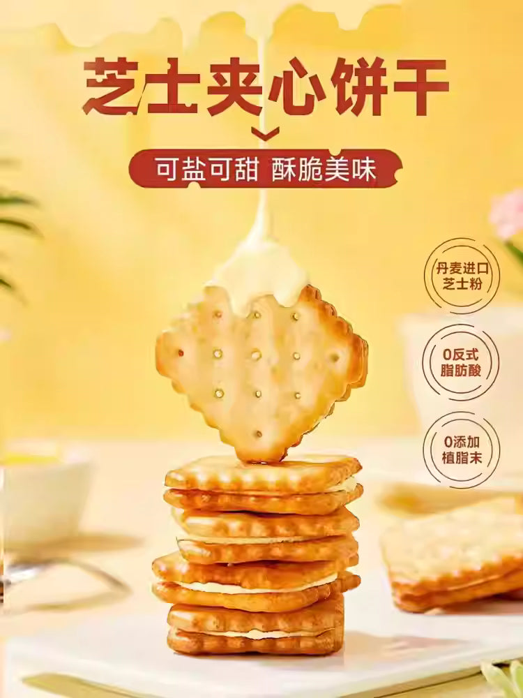 精选进口丹麦面粉与新西兰奶源制作,搭配细腻芝士夹心,呈现外酥内柔的经典口感。饼体经烘焙后层层起酥,入口酥脆轻盈,夹心芝士咸香柔滑,奶香自然释放,整体风味平衡不腻。