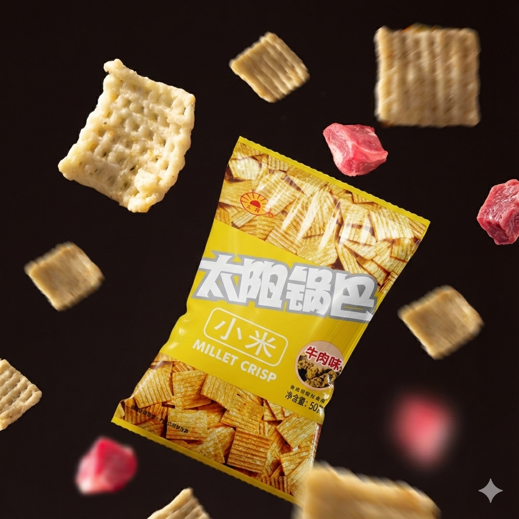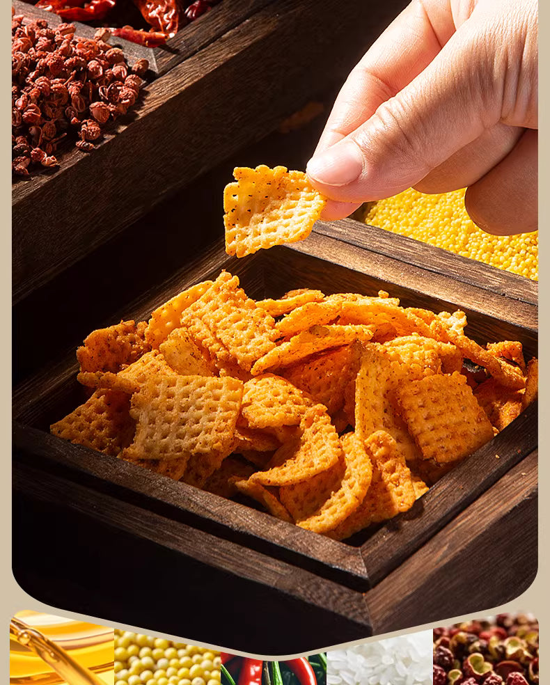 选用优质小米为主要原料,经膨化工艺制作而成,锅巴片形态规整,口感酥脆爽口。入口香脆不油腻,咀嚼时带有谷物本身的自然香气。多种调味风味融合在酥脆锅巴之中,层次分明,回味持久,是深受欢迎的经典怀旧小零食。
